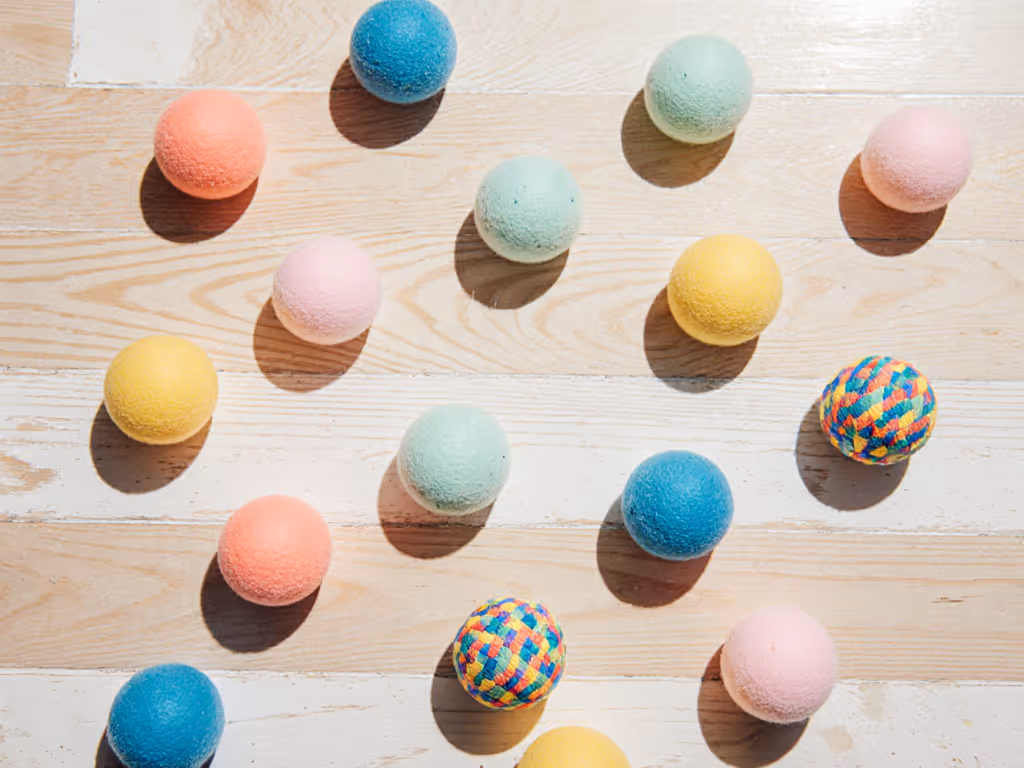- Rubber balls: Durable, predictable bounce, but heavier (louder on hard floors and more prone to rolling under furniture)