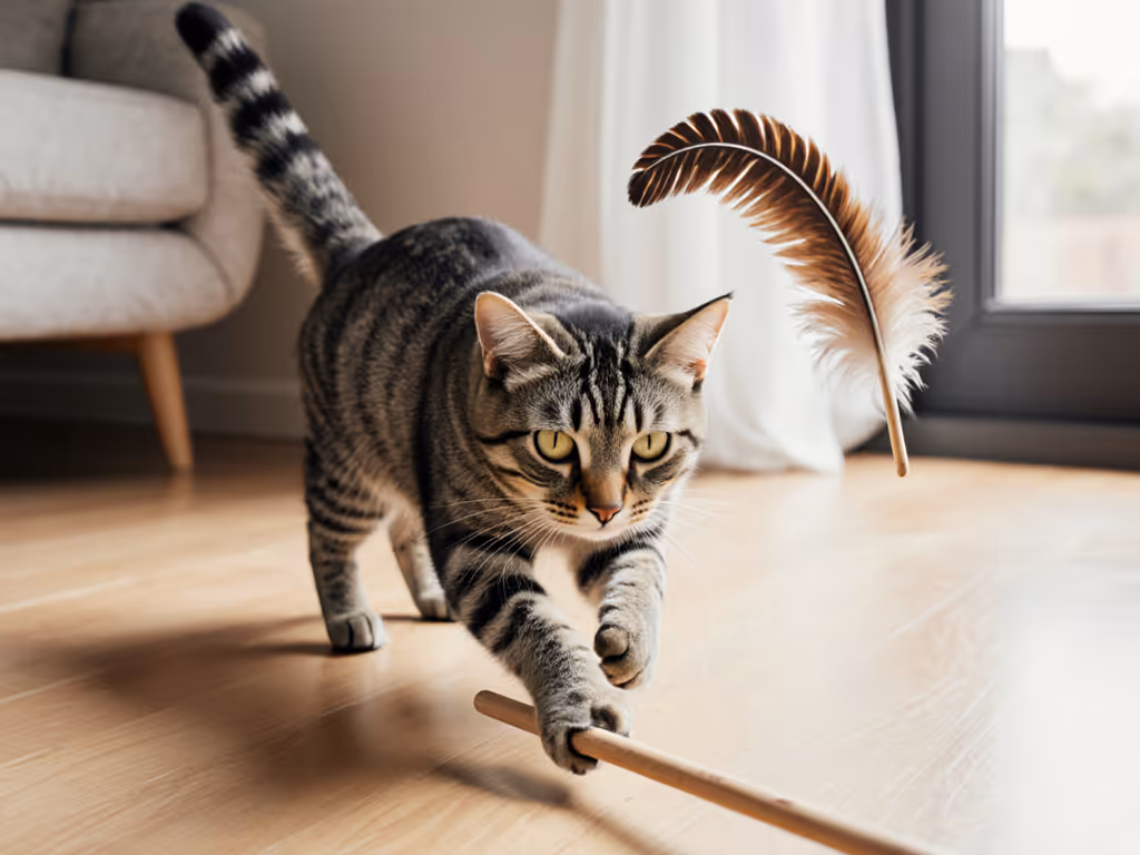 The Hunter lives for the stalk-and-pounce cycle. They'll become obsessed with toys that mimic small, quick-moving prey, especially those with unpredictable movement patterns.[1] Feather wands, teaser toys, and toys that dart or flutter will captivate them. The reward is the catching and carrying phase, so interactive play with you creates the full hunt loop they're seeking.